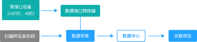 在連接不帶工作站但具有數據接口的設備時,將接口轉換器連接設備的數據接口,儀器的測試結果就會通過數據接口轉換器自動采集到操作端,再掃描樣品的條形碼,操作者即可將樣品與設備數據進行關聯。數據自動上傳到服務中心,與實驗項目進行關聯。