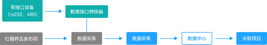 b、在連接不帶工作站但具有數(shù)據(jù)接口的設(shè)備時,將接口轉(zhuǎn)換器連接設(shè)備的數(shù)據(jù)接口,儀器的測試結(jié)果就會通過數(shù)據(jù)接口轉(zhuǎn)換器自動采集到操作端,再掃描樣品的條形碼,操作者即可將樣品與設(shè)備數(shù)據(jù)進行關(guān)聯(lián)。數(shù)據(jù)自動上傳到服務(wù)中心,與實驗項目進行關(guān)聯(lián)。